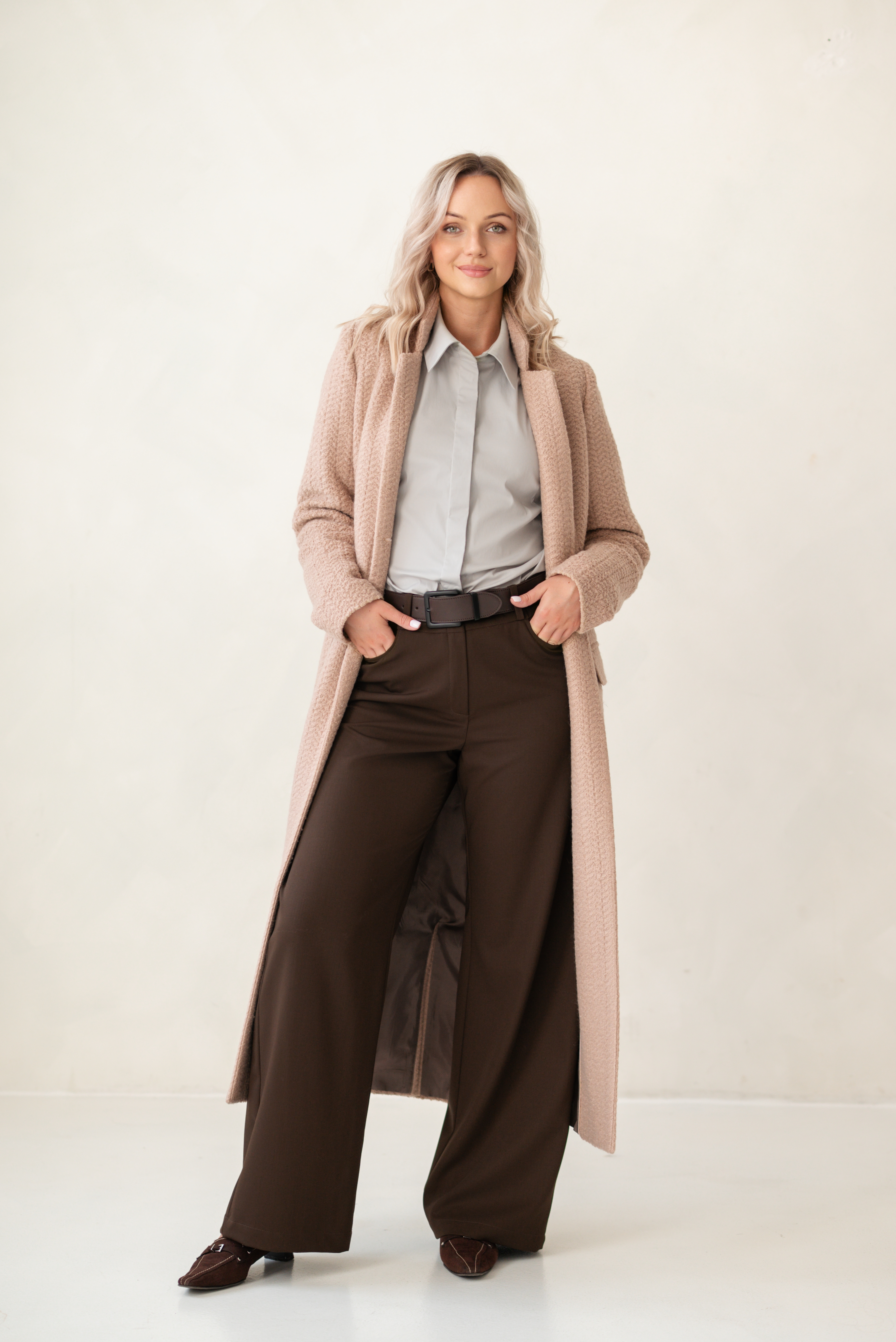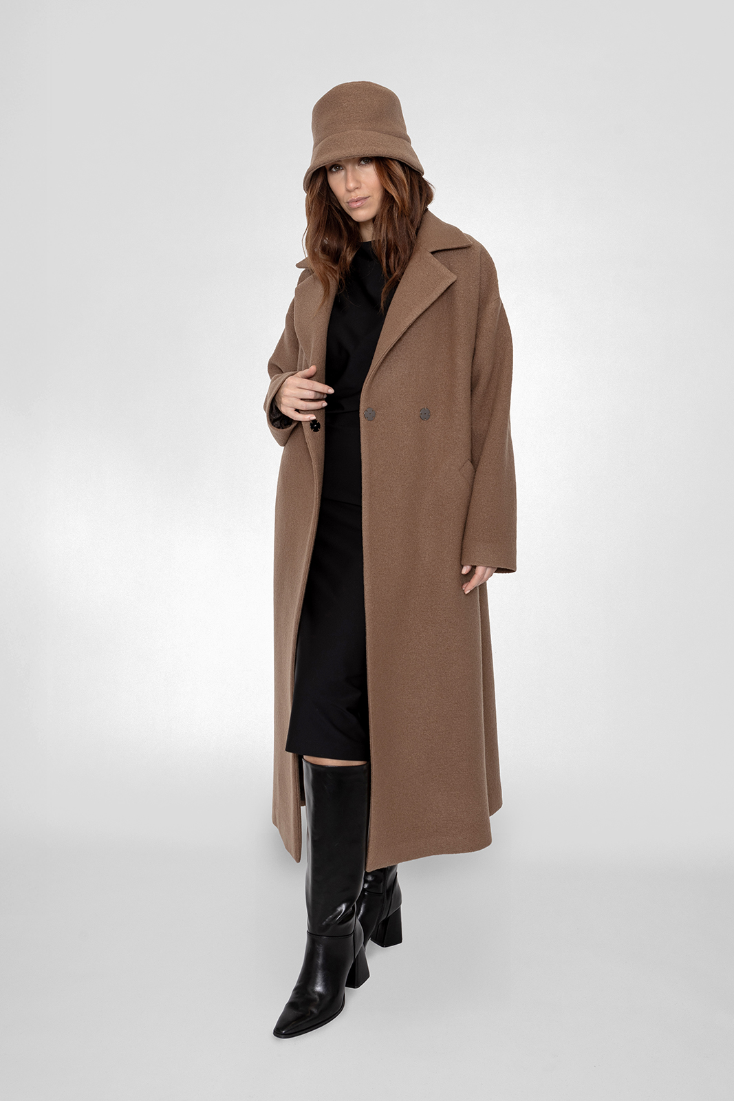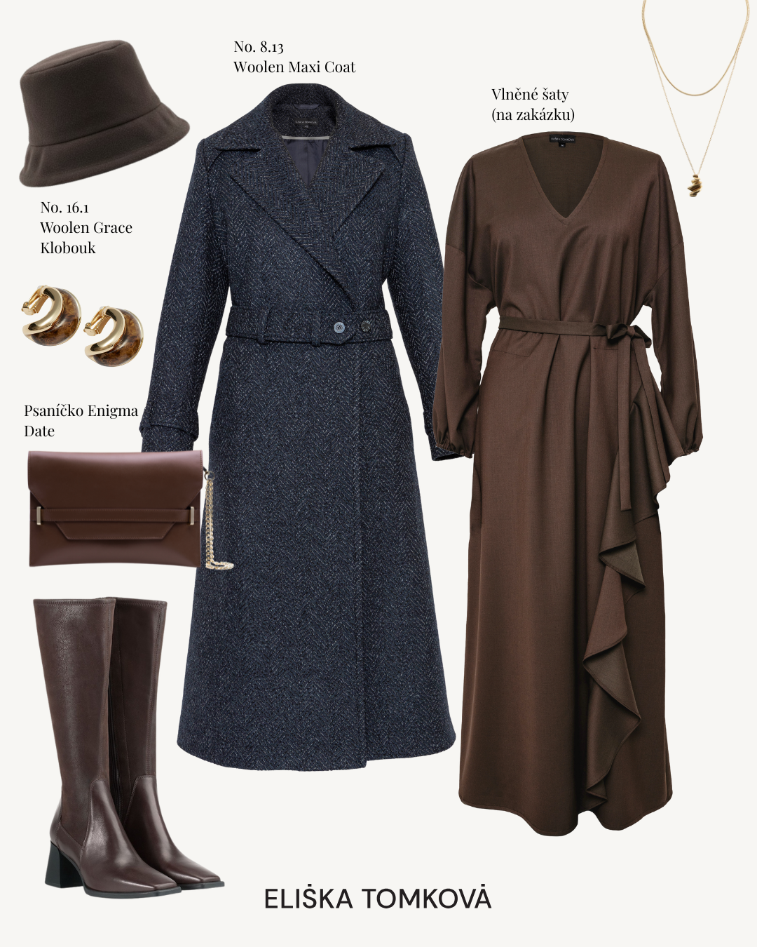 Vlněný kabát funguje i v monochromatických kombinacích. Béžová, hnědá, šedá nebo černá dávají vyniknout střihu, materiálu a detailům. Bez potřeby výrazných doplňků.