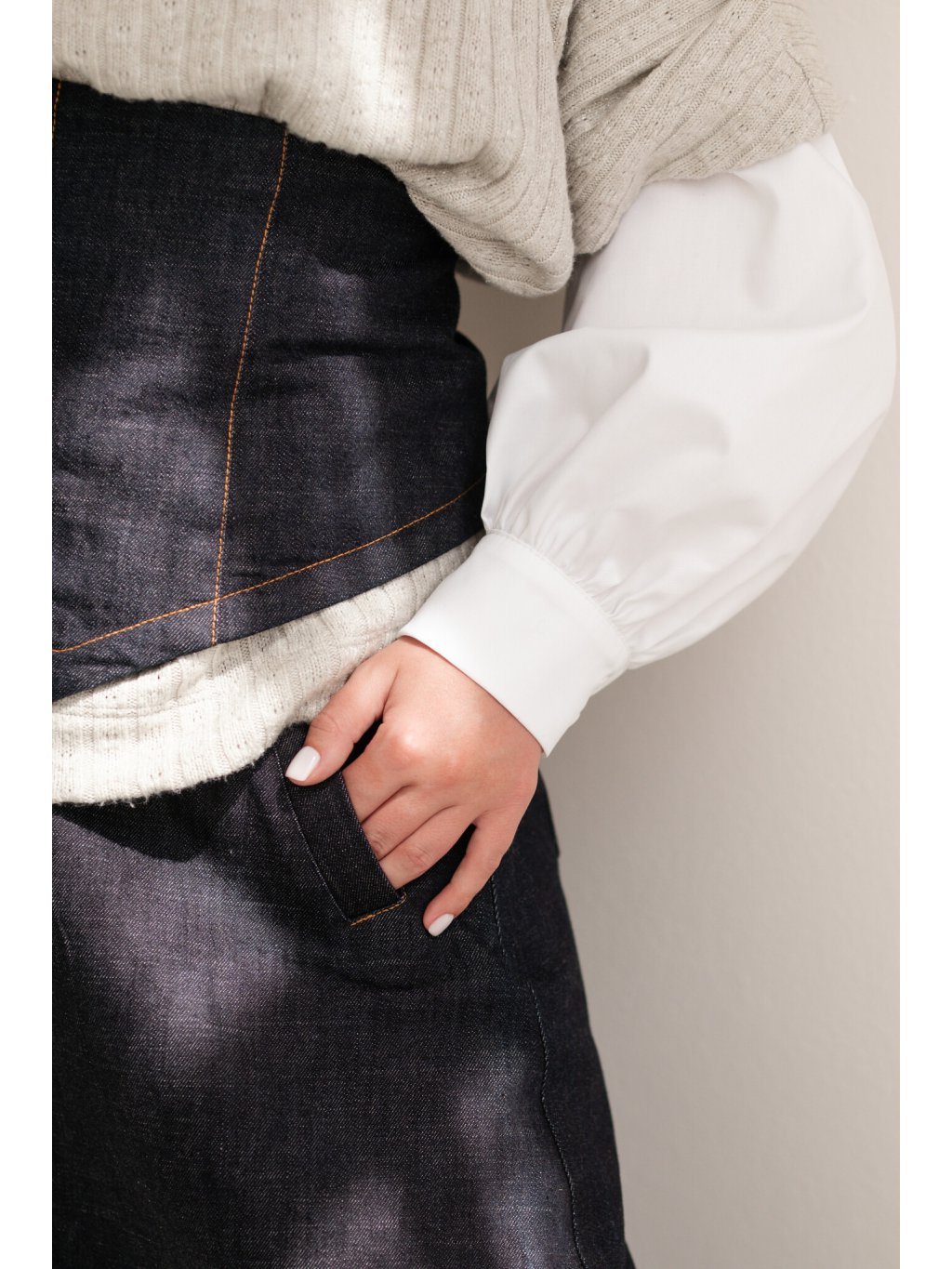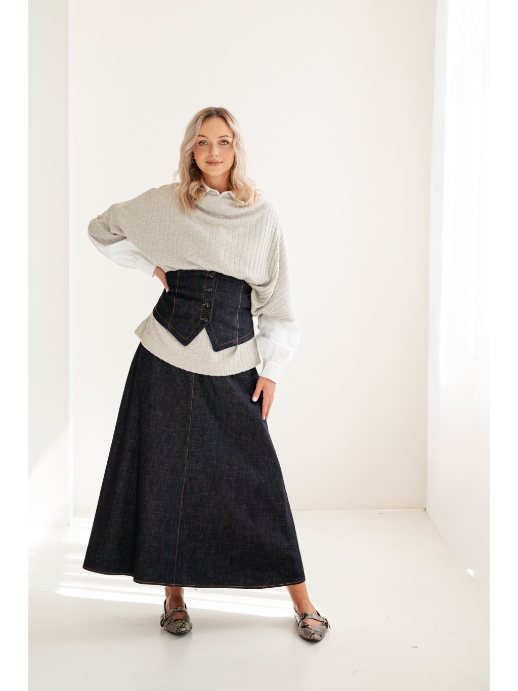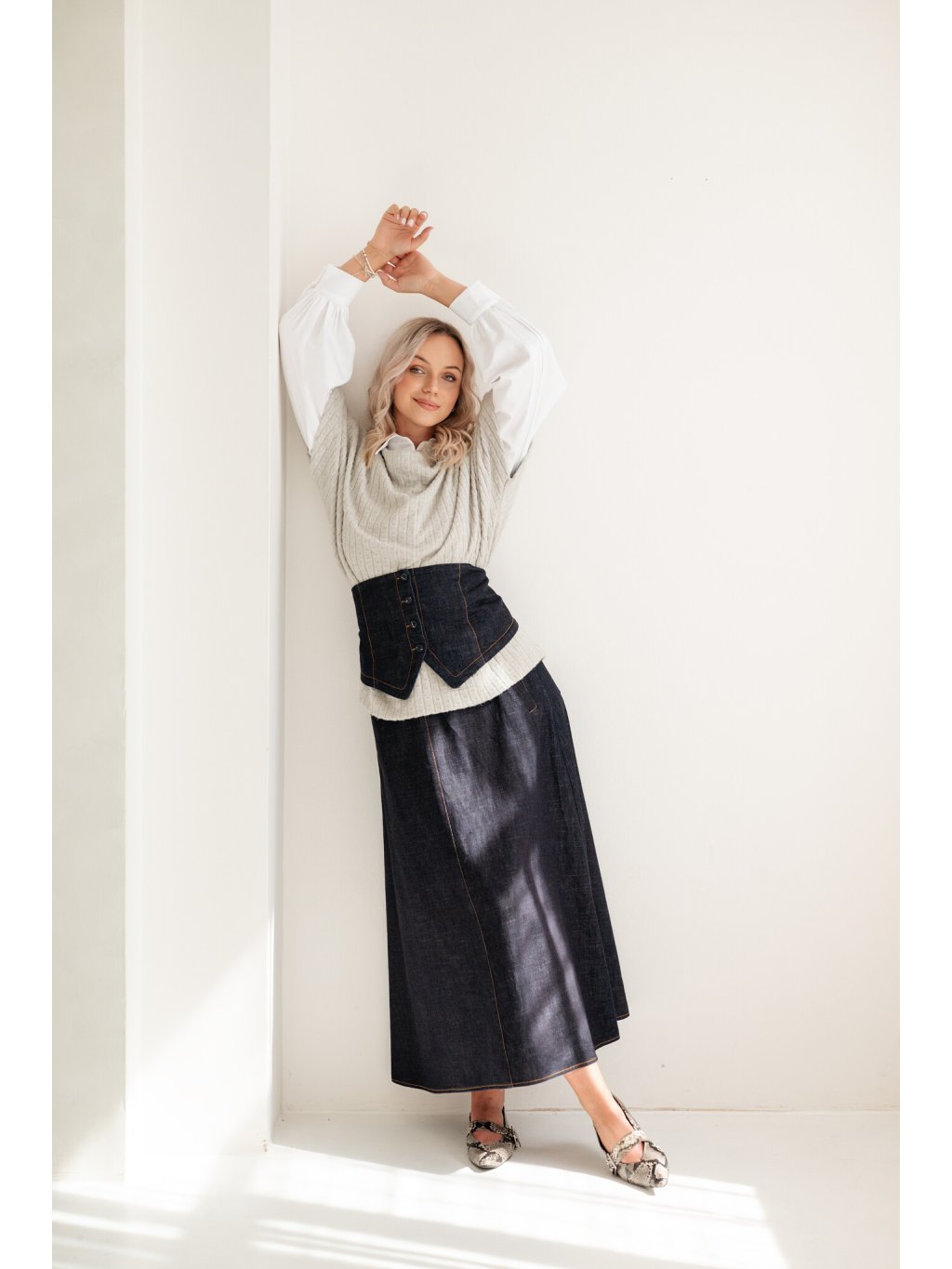 Moderní Denim: Pásek je ušitý z kvalitního tmavě modrého denimu, který přináší do klasického korzetového tvaru moderní, neformální texturu. Kontrastní prošívání podtrhuje denimový původ.