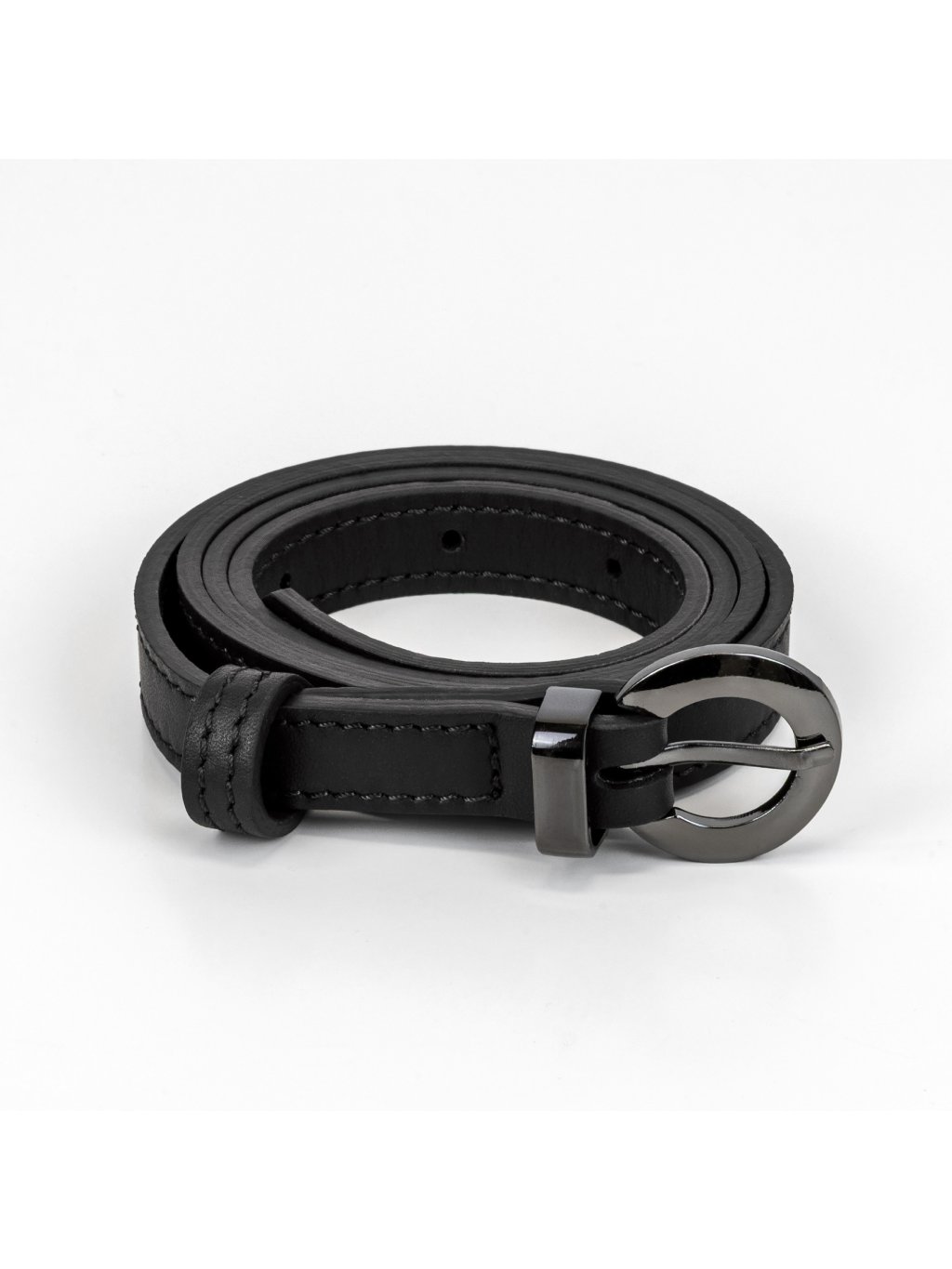 Úzký pásek z jemné černé kůže s decentní kulatou přezkou je minimalistický doplněk, který působí žensky, ale sebevědomě. Skvěle se hodí jak přes šaty, tak k elegantním kalhotám.