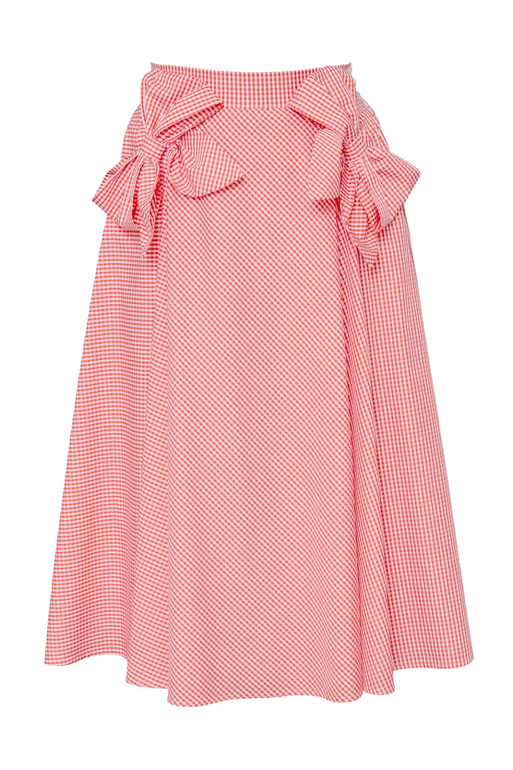 Tato sukně kombinuje klasický střih kolové sukně s výrazným prvkem mašlí, které dodávají modelu ženskost a strukturu.