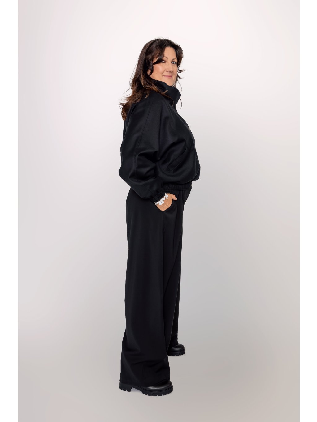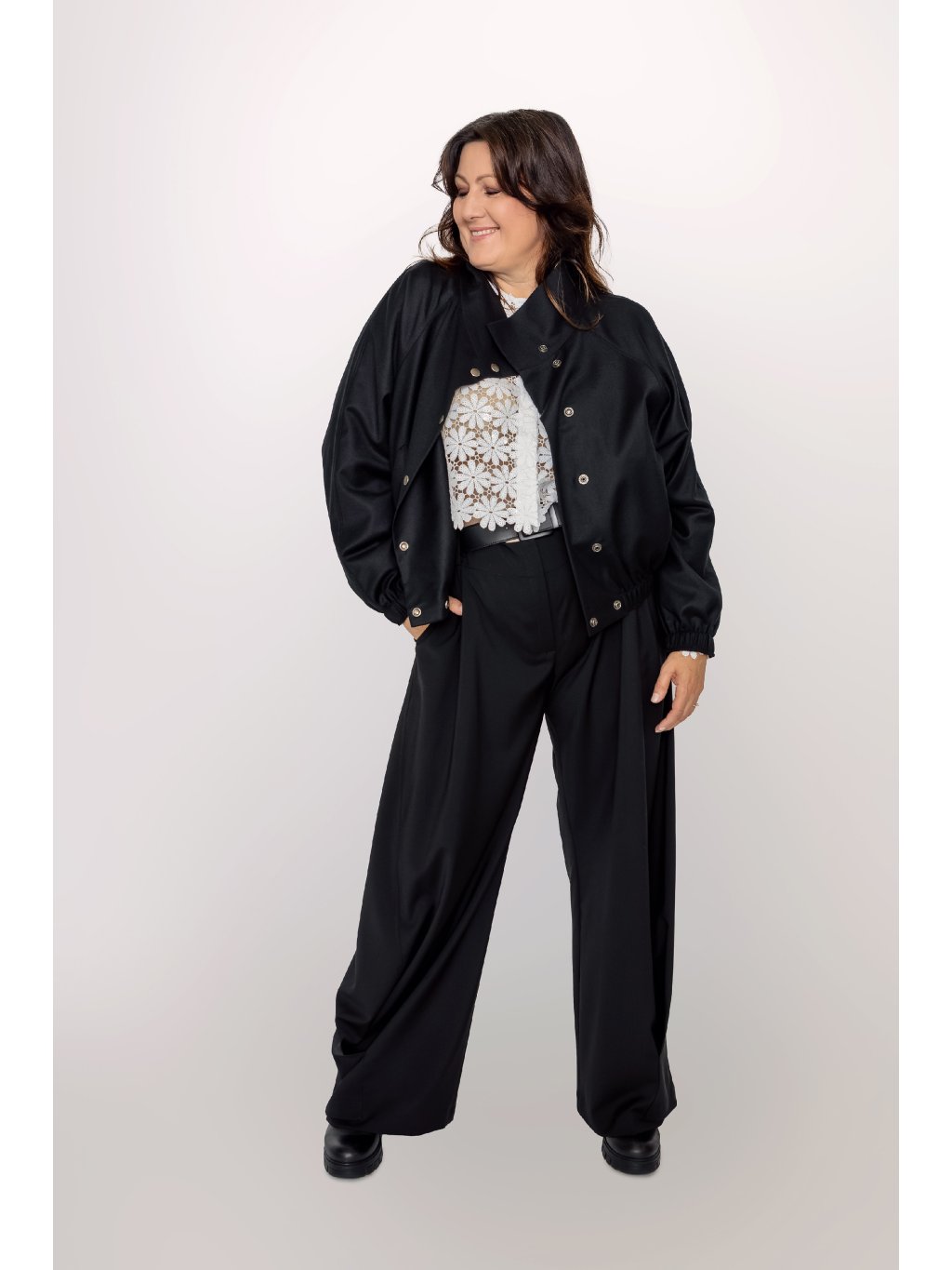 Kalhoty se pyšní širokým střihem nohavic, který se volně vlní při každém kroku. Tento objem je v rovnováze s vysokým pasem, což opticky prodlužuje siluetu.