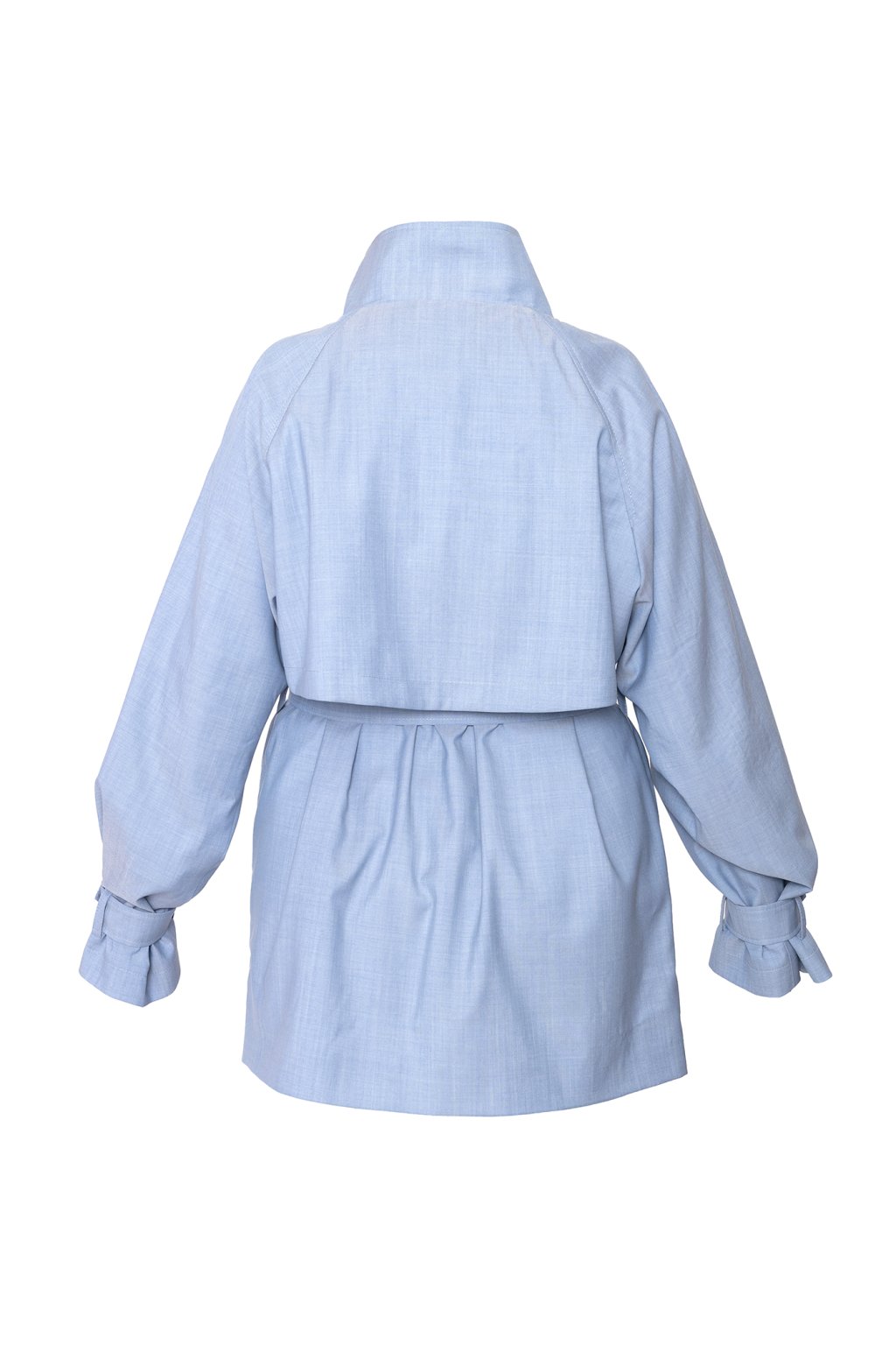 Zadní část s volným sedlem dodává kabátku dynamiku a odkazuje na klasickou krejčovinu. Světle modrý odstín osvěží šatník a snadno se kombinuje s neutrálními barvami. Detaily v podobě kovových druků a pásků na manžetách podtrhují vysokou kvalitu zpracování a smysl pro detail.