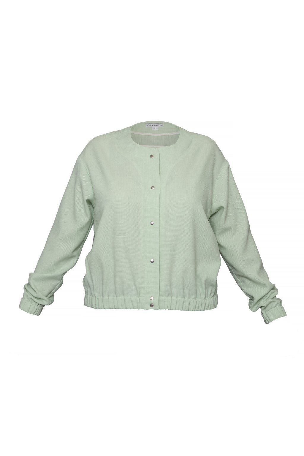 Lehká bundička v tlumeném zeleném tónu. Má uvolněný střih, zkrácenou délku a jemné řasení v pase i na rukávech (do gumy), takže krásně drží tvar.
