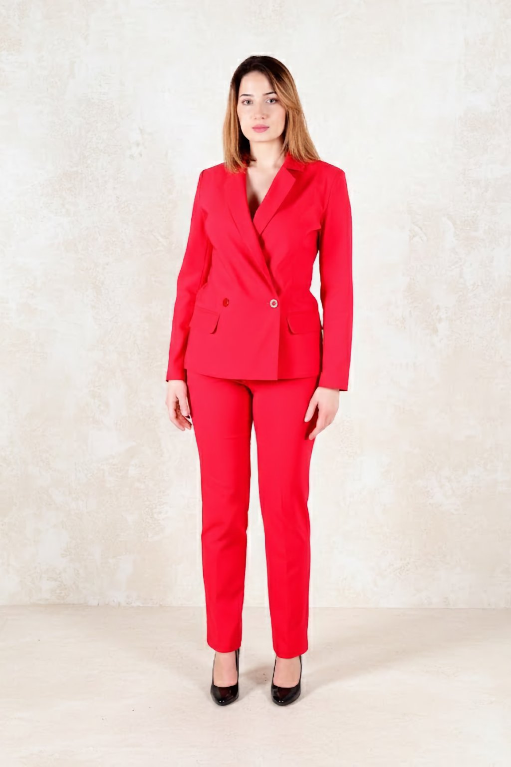 Červené sako: 70 % viskóza, 27 % polyamid, 3 % elastan